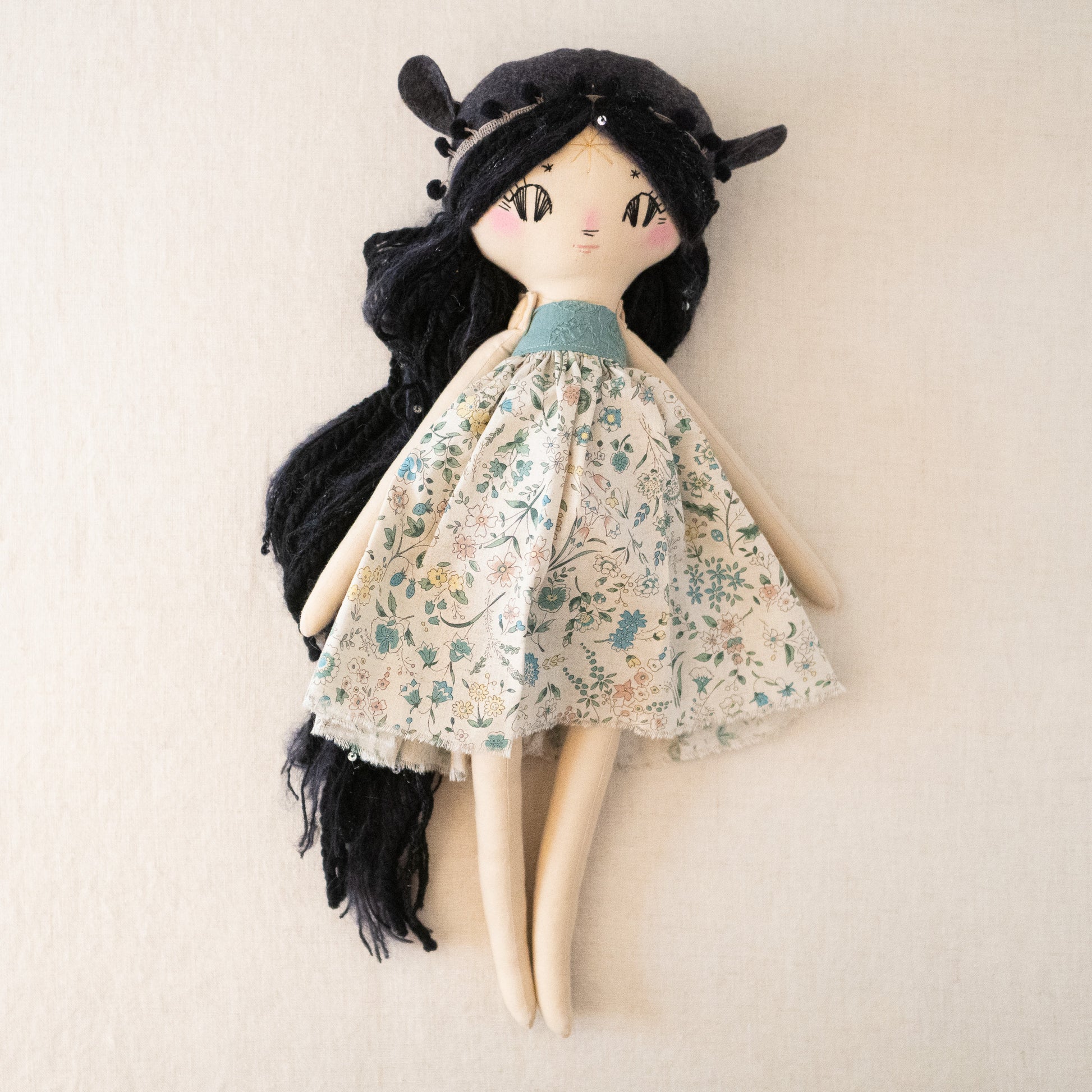 This unique doll is made up of cotton, wool/rayon felt, and stuffed with recycled pollyfill. The yarn hair is a combination of wool, mohair, and acrylic yarn. All of our dolls have button-jointed arms. Each doll is lovingly hand stitched in Asheville, North Carolina.