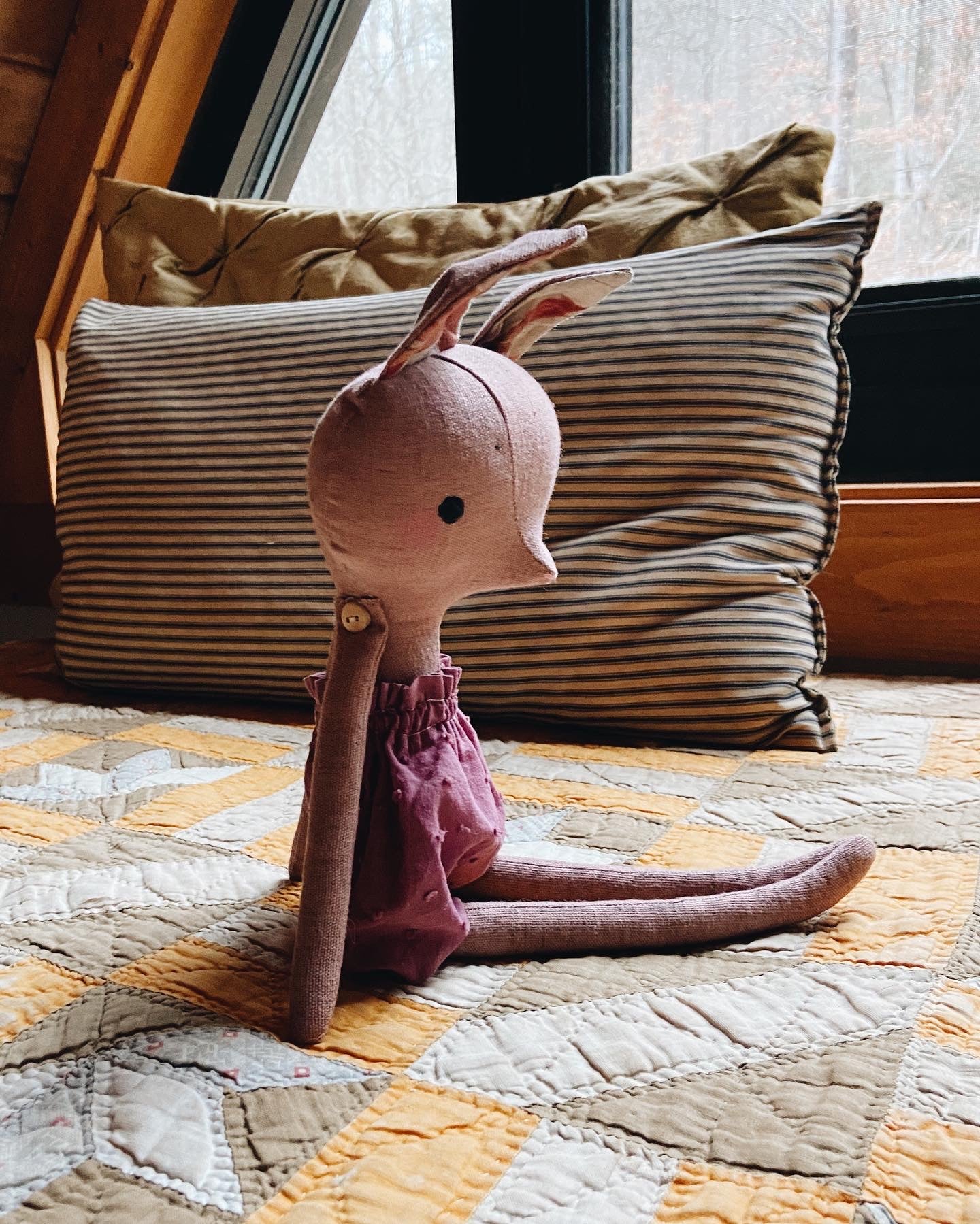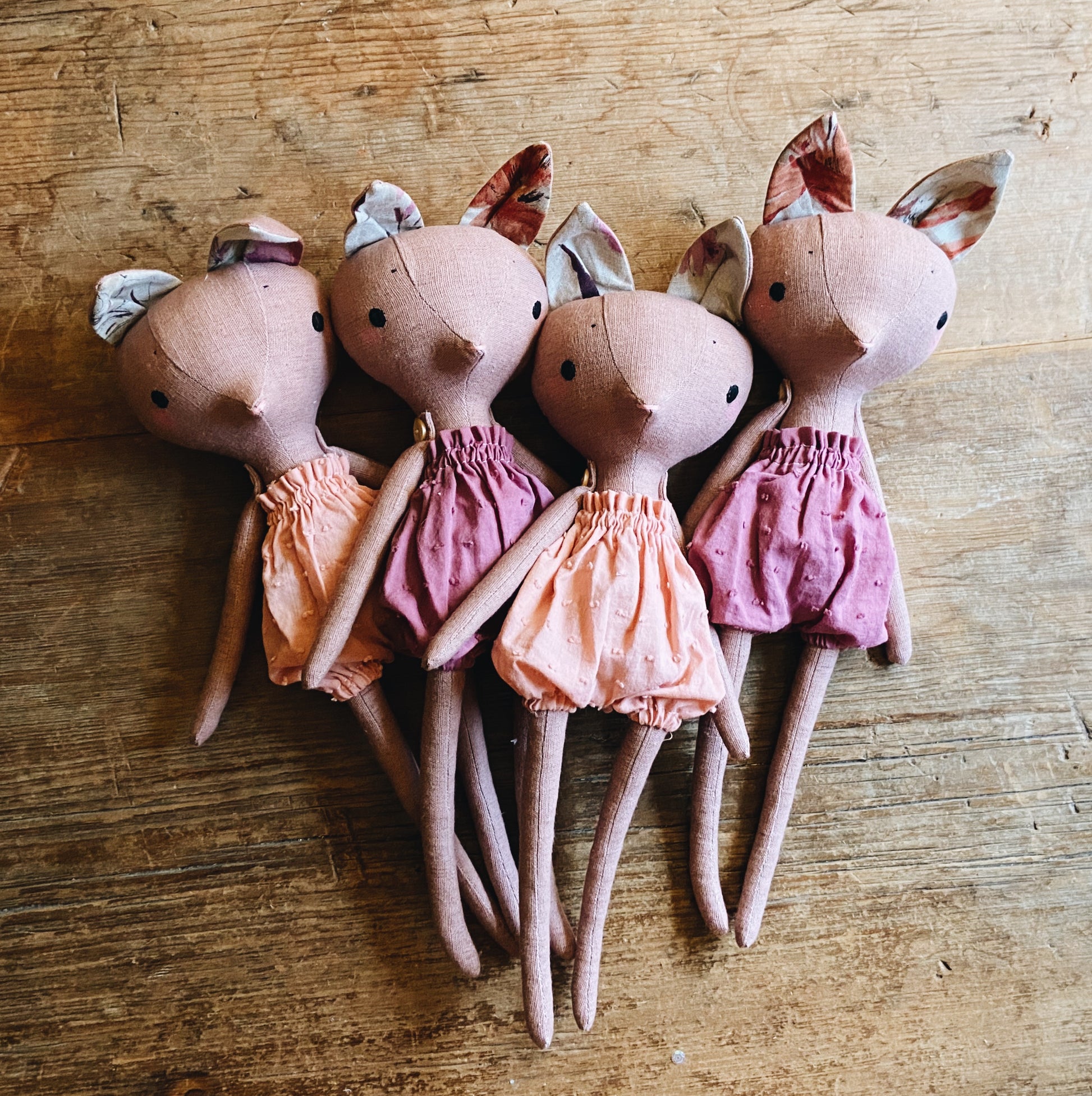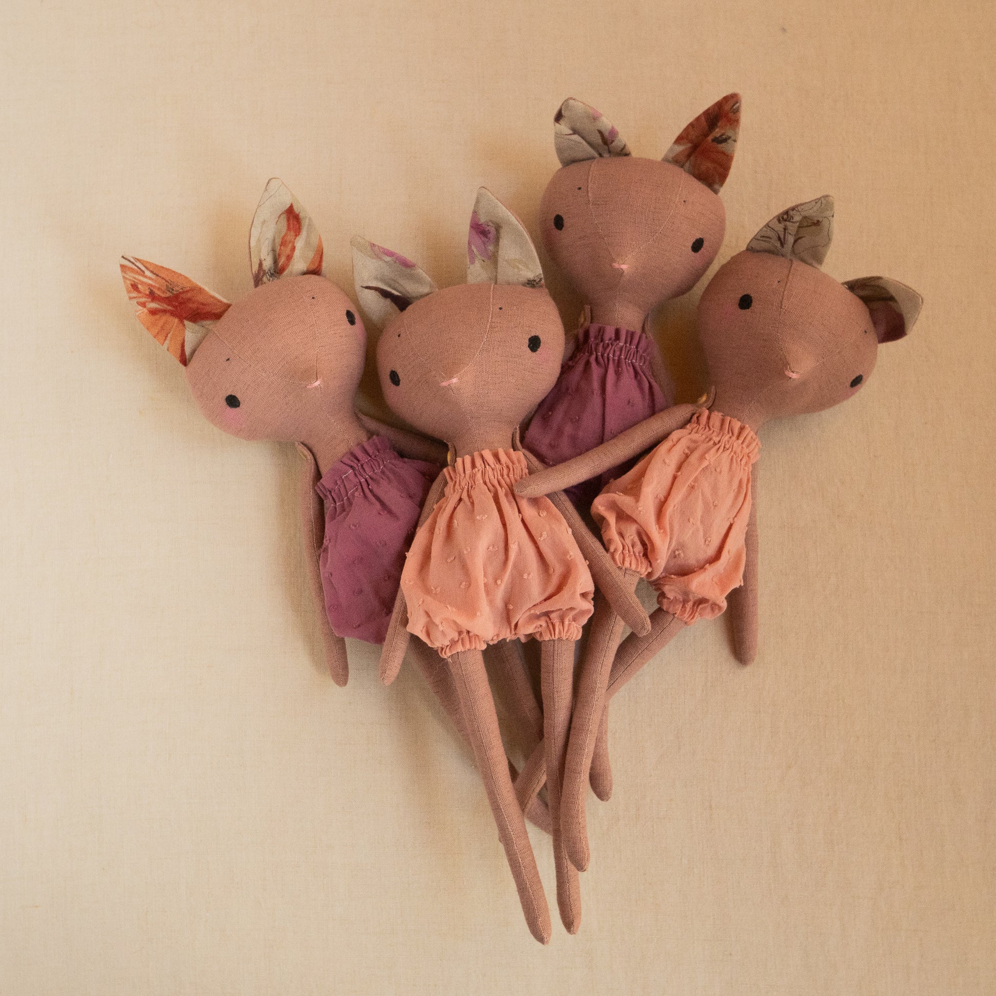 Our Forest Friends are made from linen and cotton/linen blends and have button-joined arms. These limited edition friends are made From hand dyed Kye and Hardy linen. You can expect exquisite color and as with all hand dying some imperfectly perfect variation in tone and color within each piece. Each doll is lovingly hand-stitched in Asheville, North Carolina.