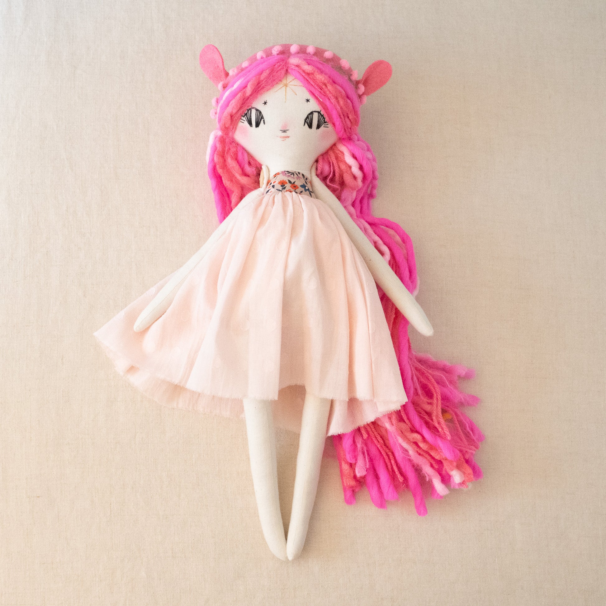 This unique doll is made up of cotton, wool/rayon felt, and stuffed with recycled pollyfill. The yarn hair is a combination of wool, mohair, and acrylic yarn. All of our dolls have button-jointed arms. Each doll is lovingly hand stitched in Asheville, North Carolina.
