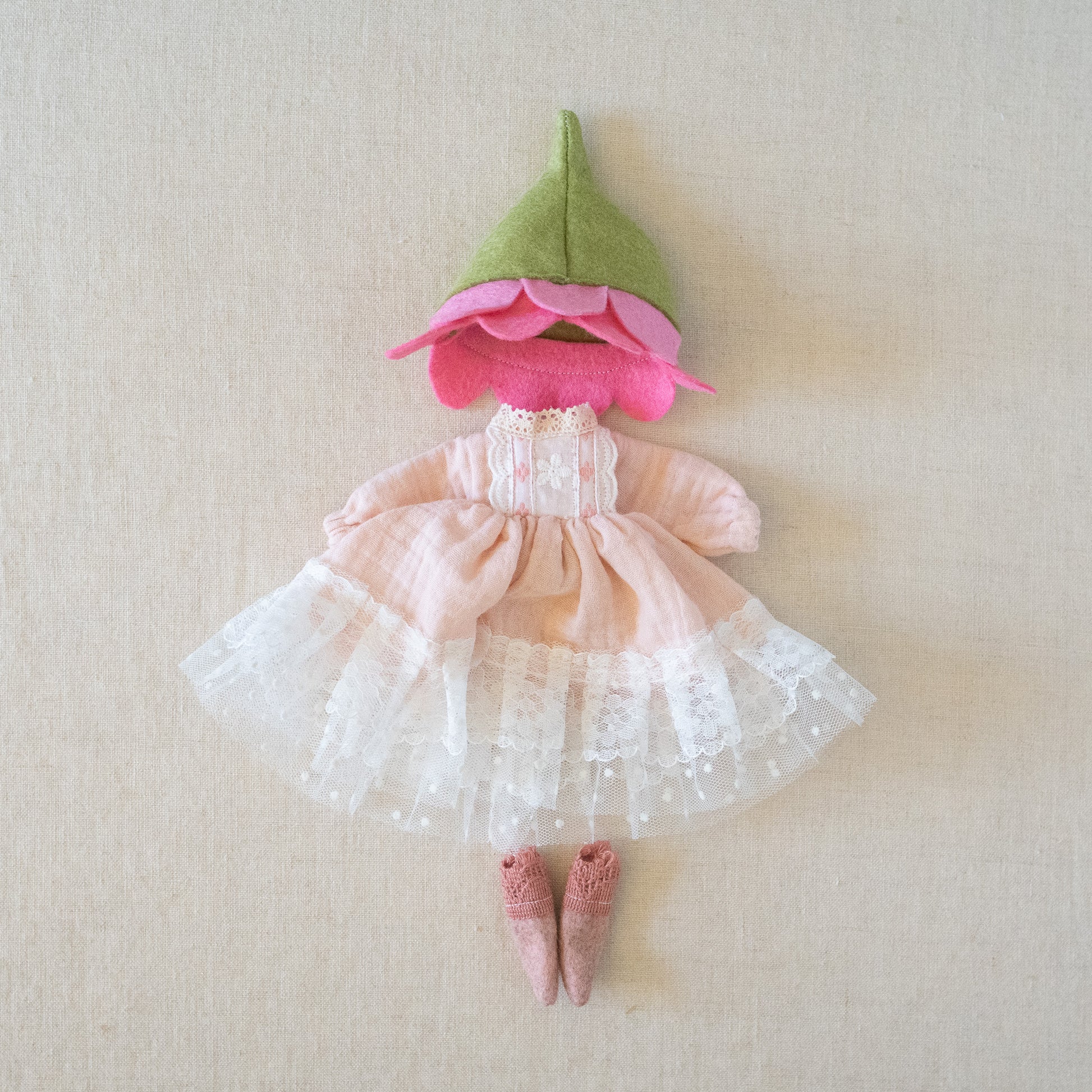 A whimsical outfit set that includes - a detailed dress, felt/lace booties, and little rosebud hat.