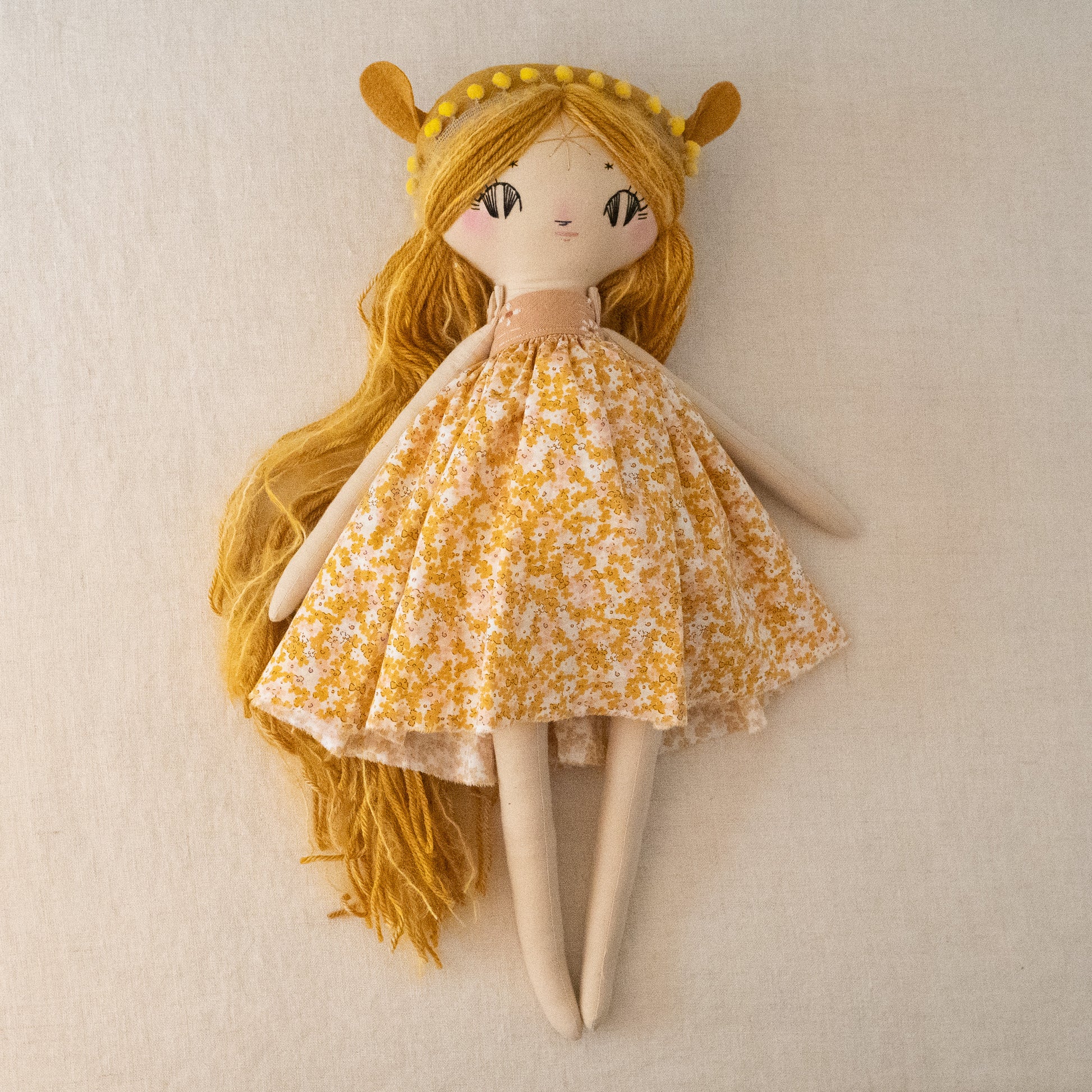 This unique doll is made up of cotton, wool/rayon felt, and stuffed with recycled pollyfill. The yarn hair is a combination of wool, mohair, and acrylic yarn. All of our dolls have button-jointed arms. Each doll is lovingly hand stitched in Asheville, North Carolina.