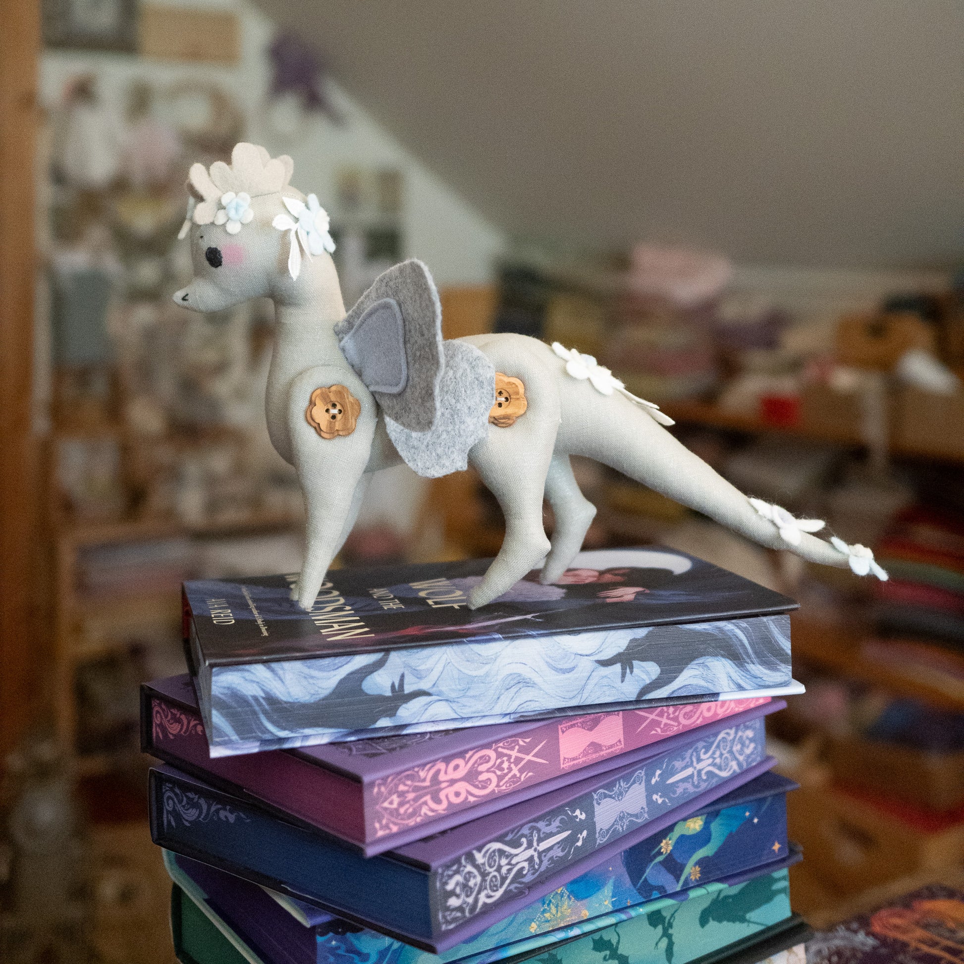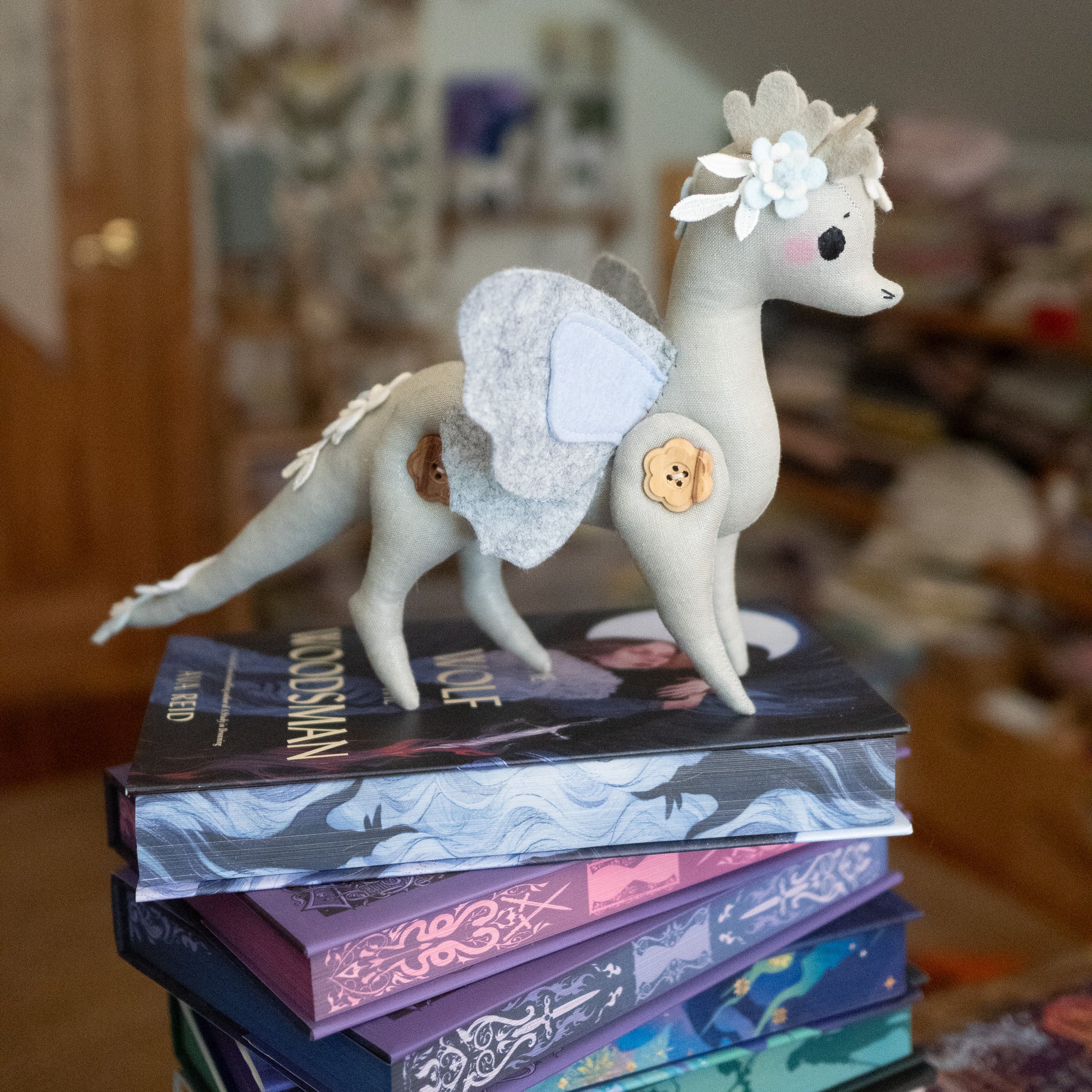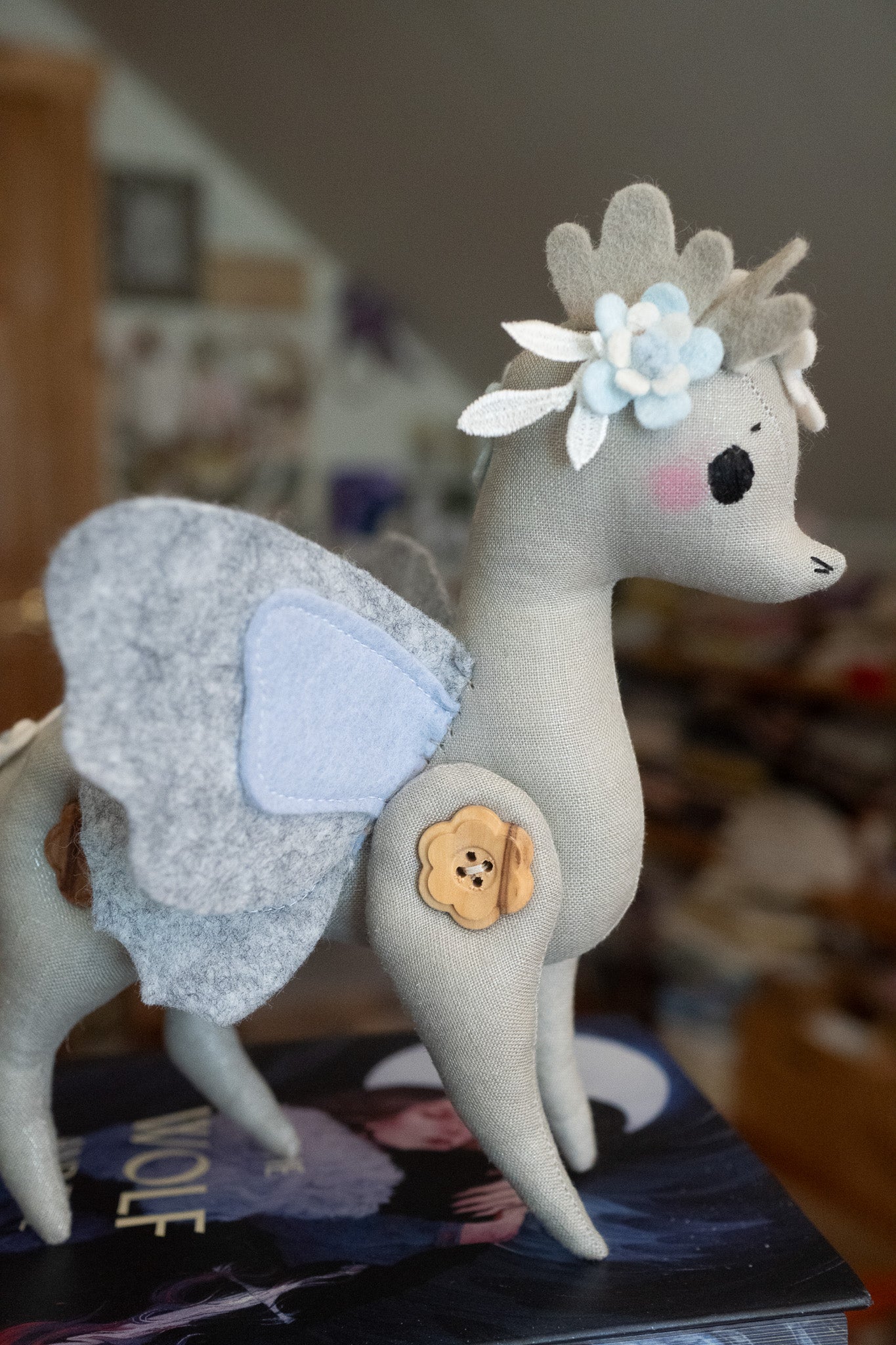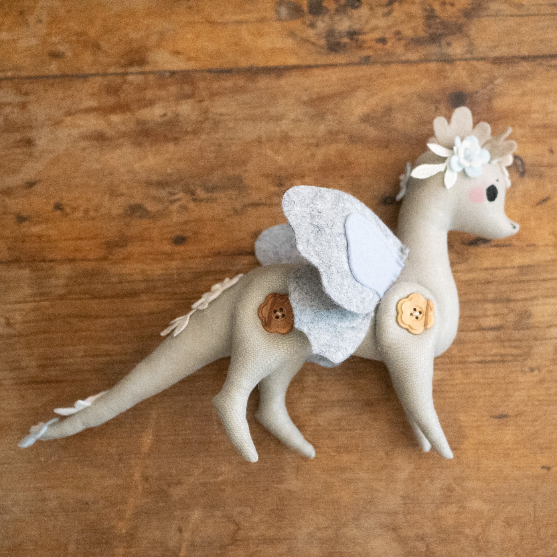 This little button dragon is ever so sweet and magical! She is not meant as a toy as much as a beautiful display/decor item and would look so whimsical on top of a stack of pretty books or standing pretty on a shelf full of special things.