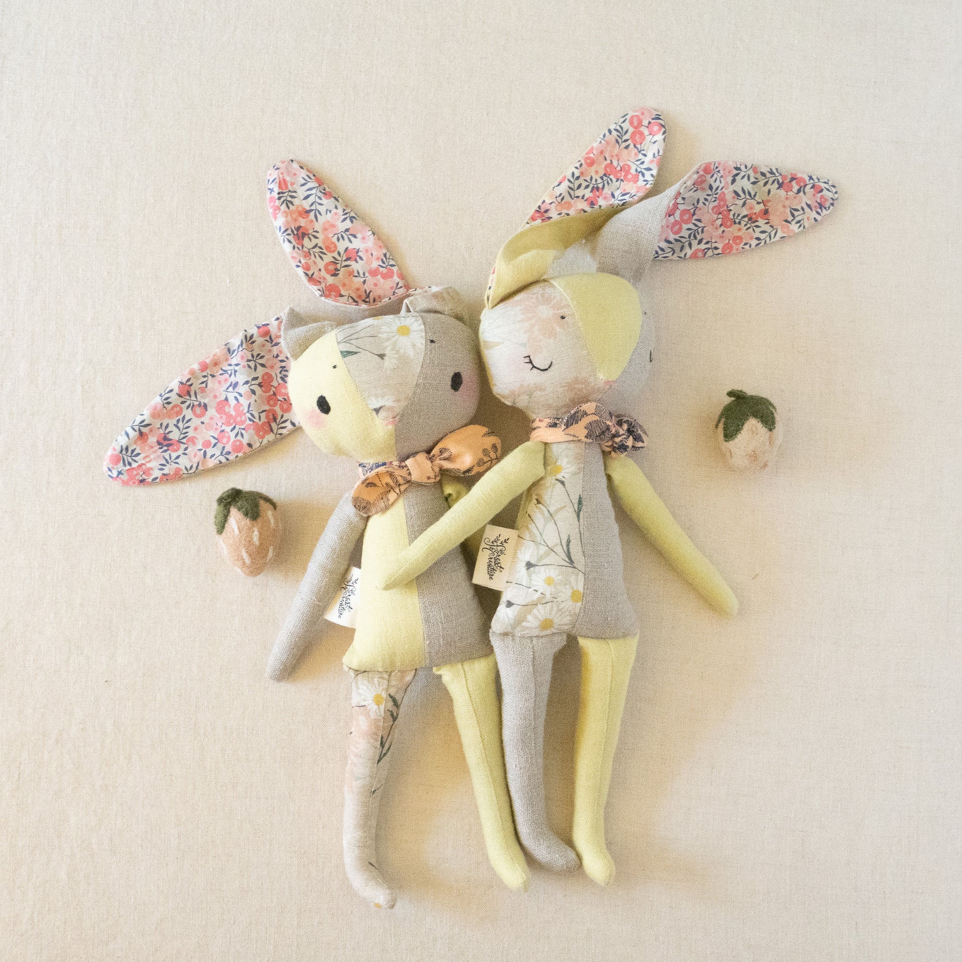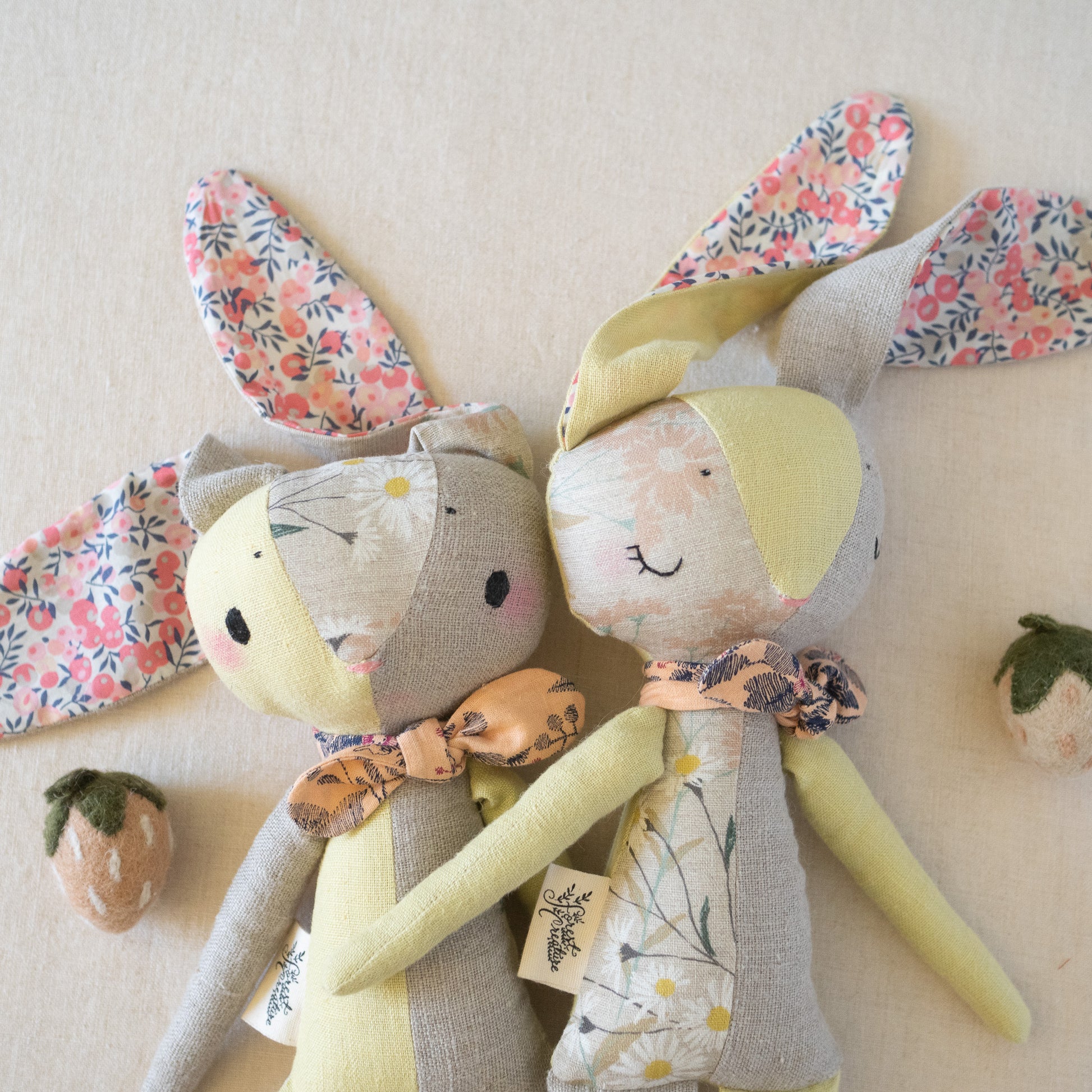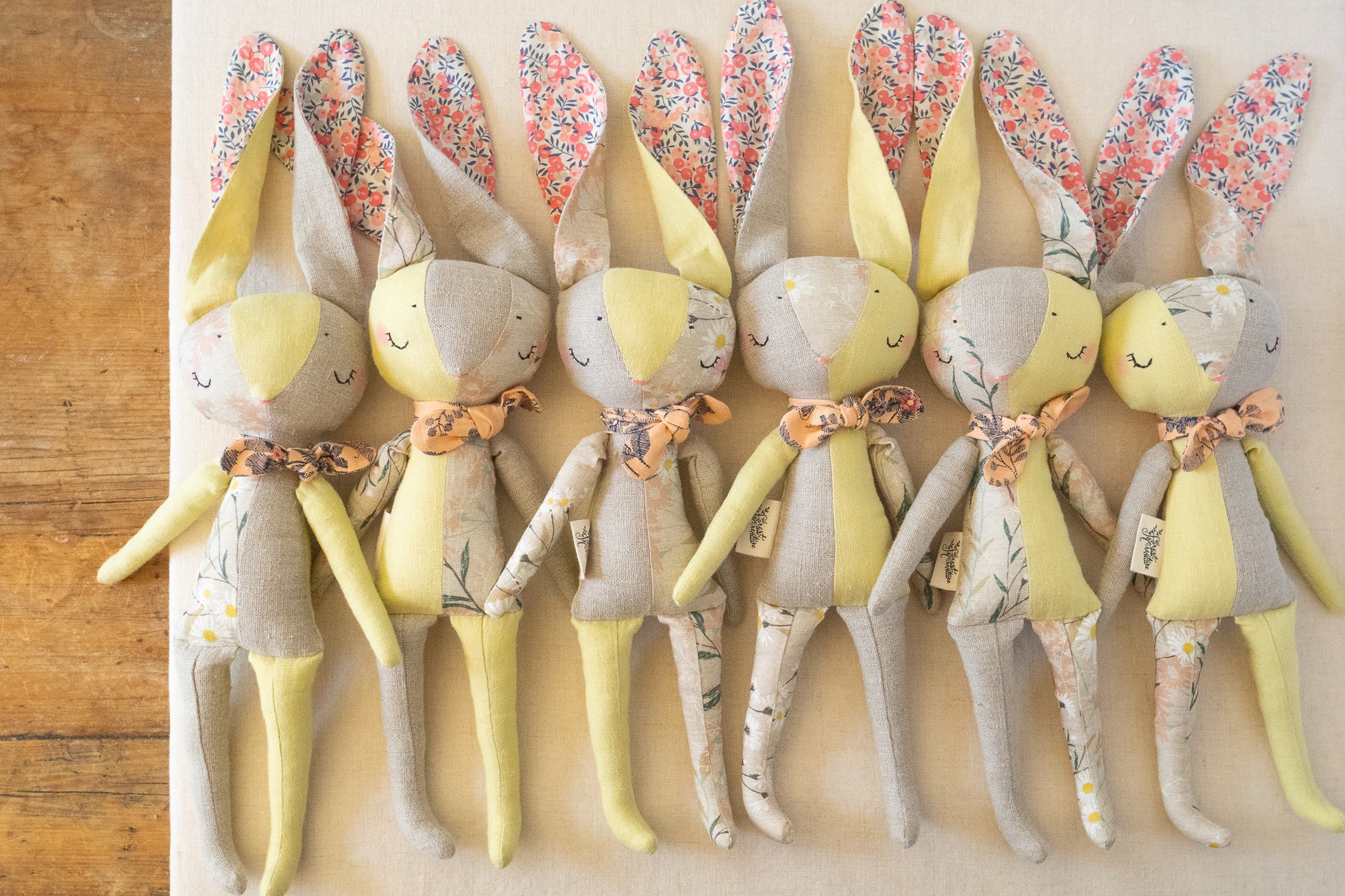 Our Cuddle Bunnies are made from a mix of fabrics. Each doll is lovingly hand stitched in Asheville, North Carolina.