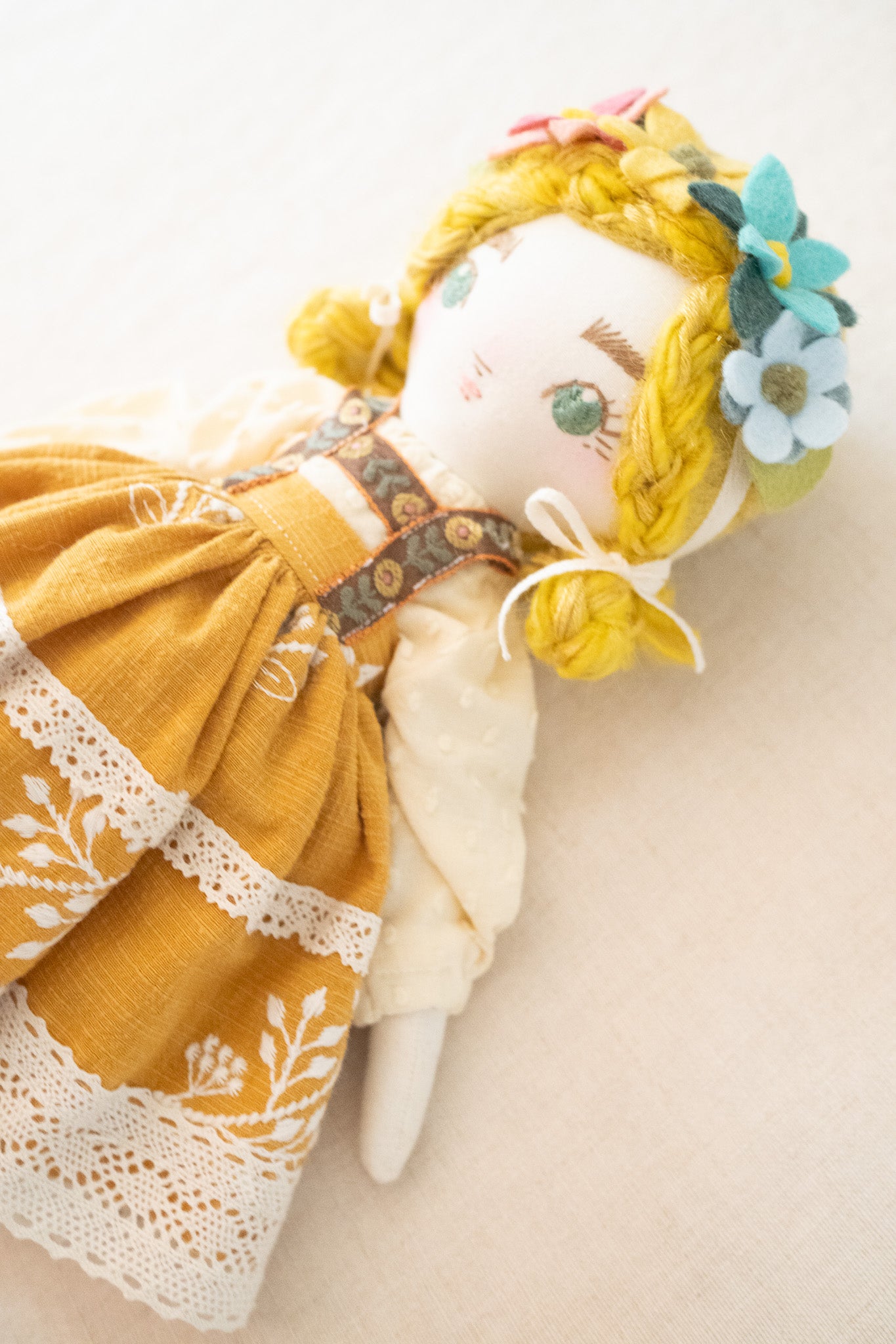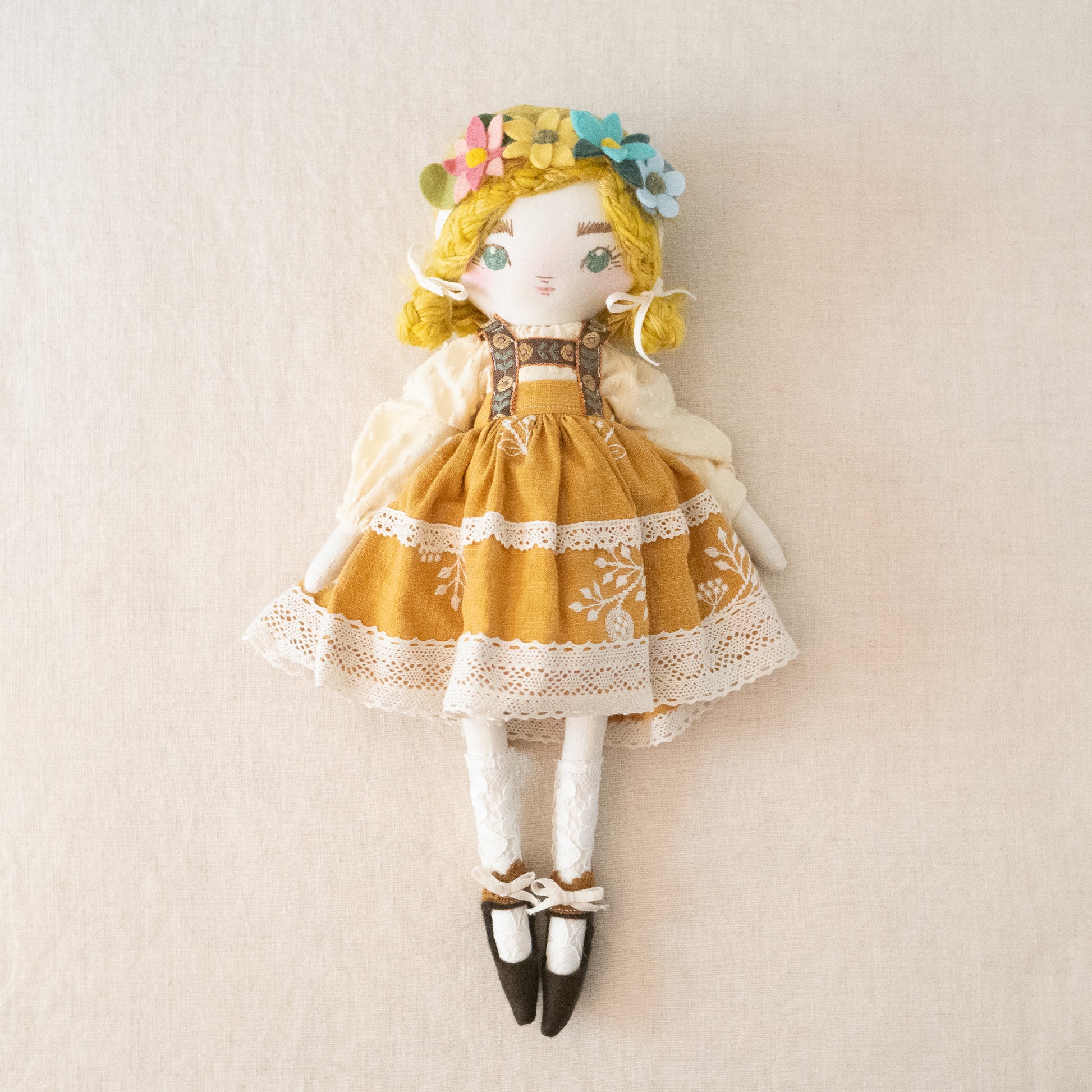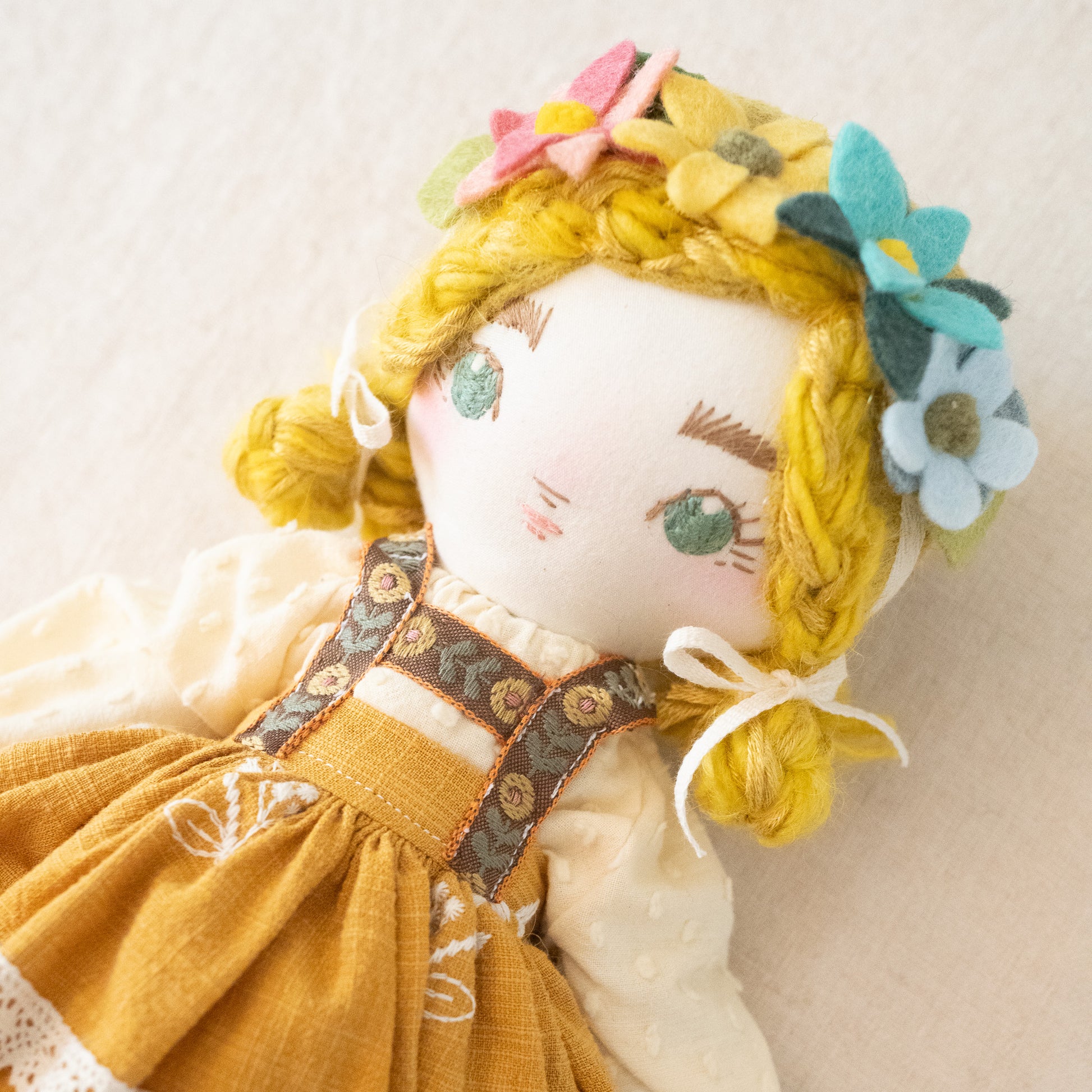 This unique doll is made up of cotton, wool/rayon felt, and stuffed with recycled pollyfill. The yarn hair is a combination of wool, mohair, and acrylic yarn. All of our dolls have button-jointed arms. Each doll is lovingly hand stitched in Asheville, North Carolina.
