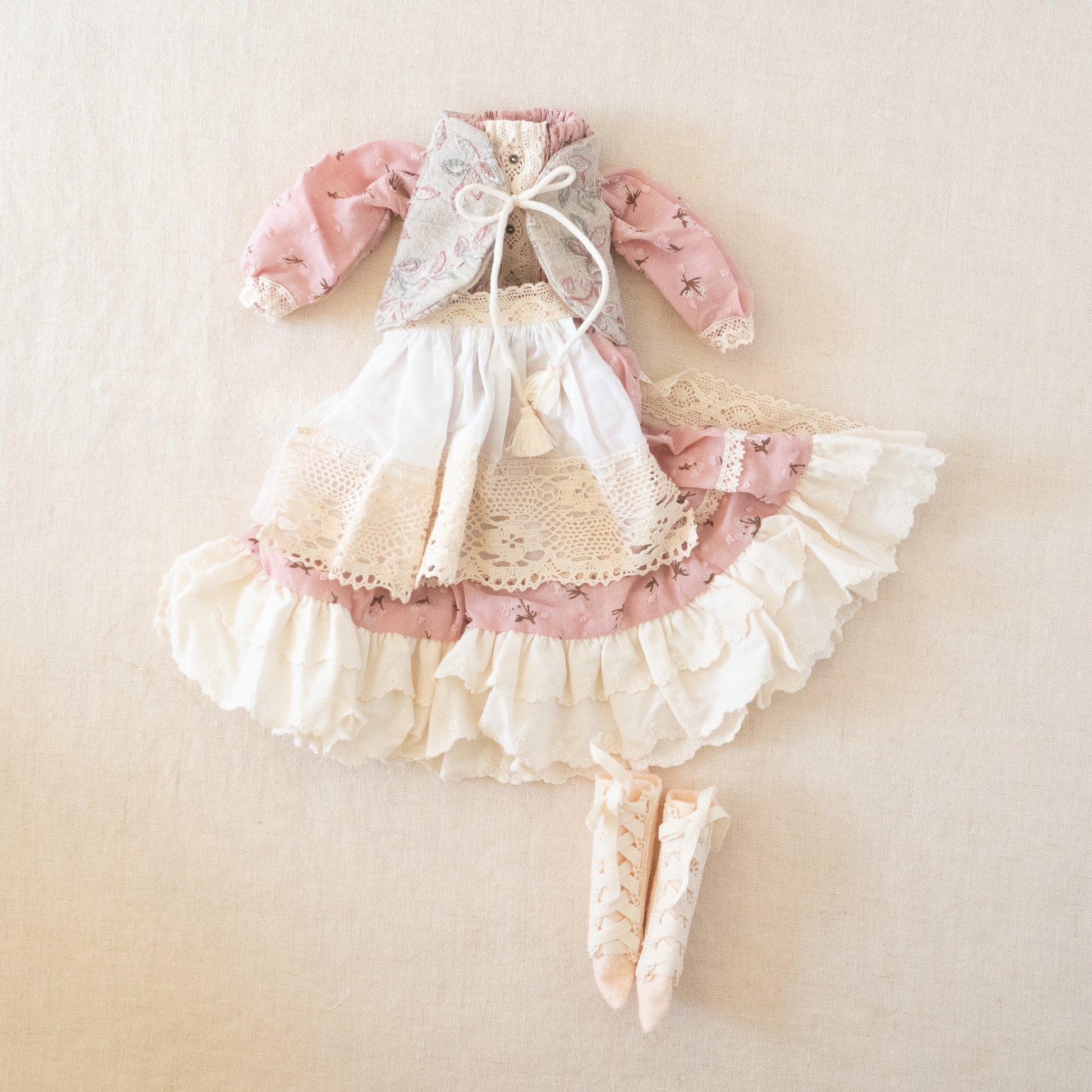 A lovely little outfit for our largest 20" dolls with a lace trimmed and button adorned blouse, beautiful ruffled skirt, lace trimmed apron, vest, and lace up felt boots.