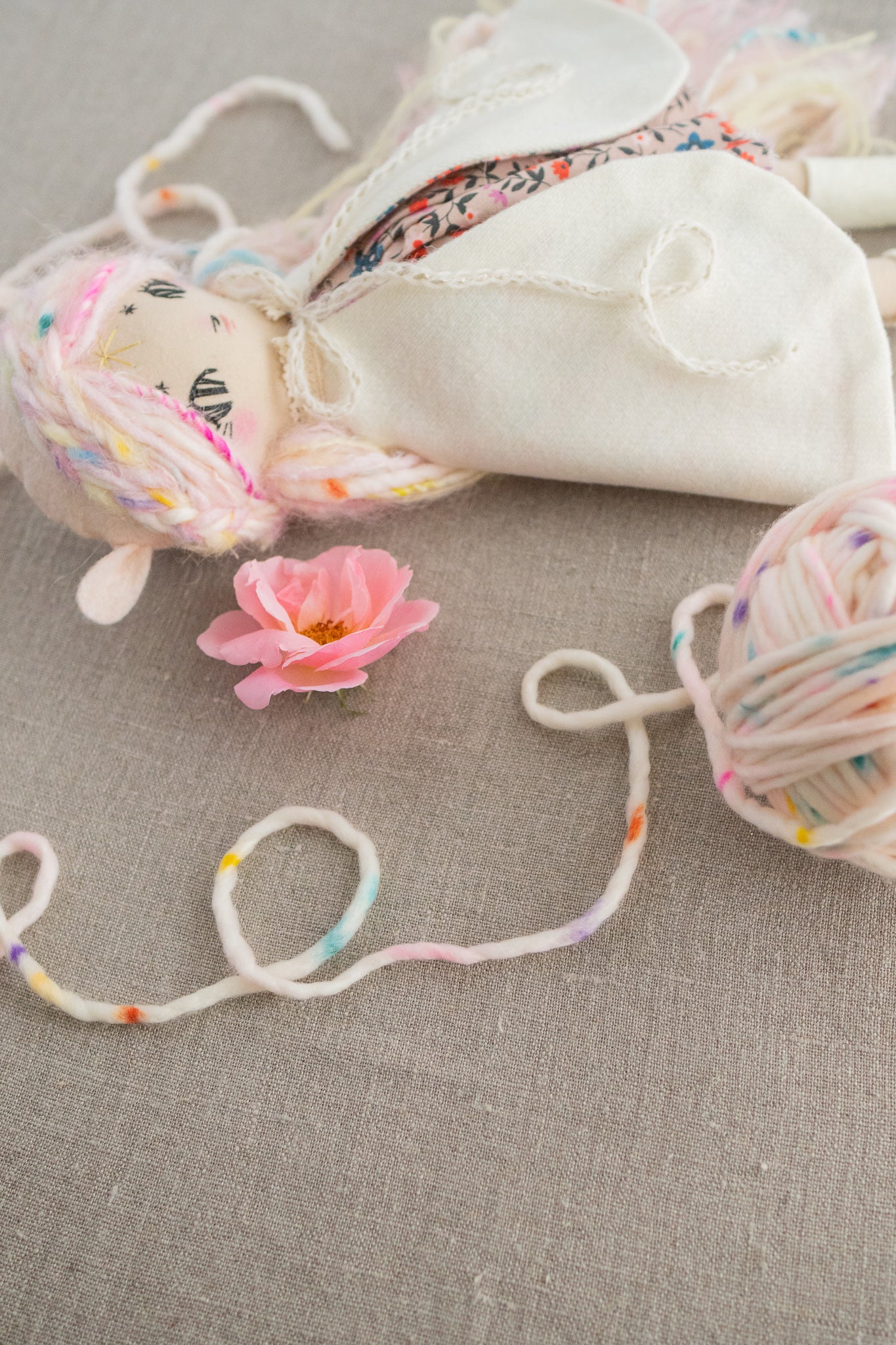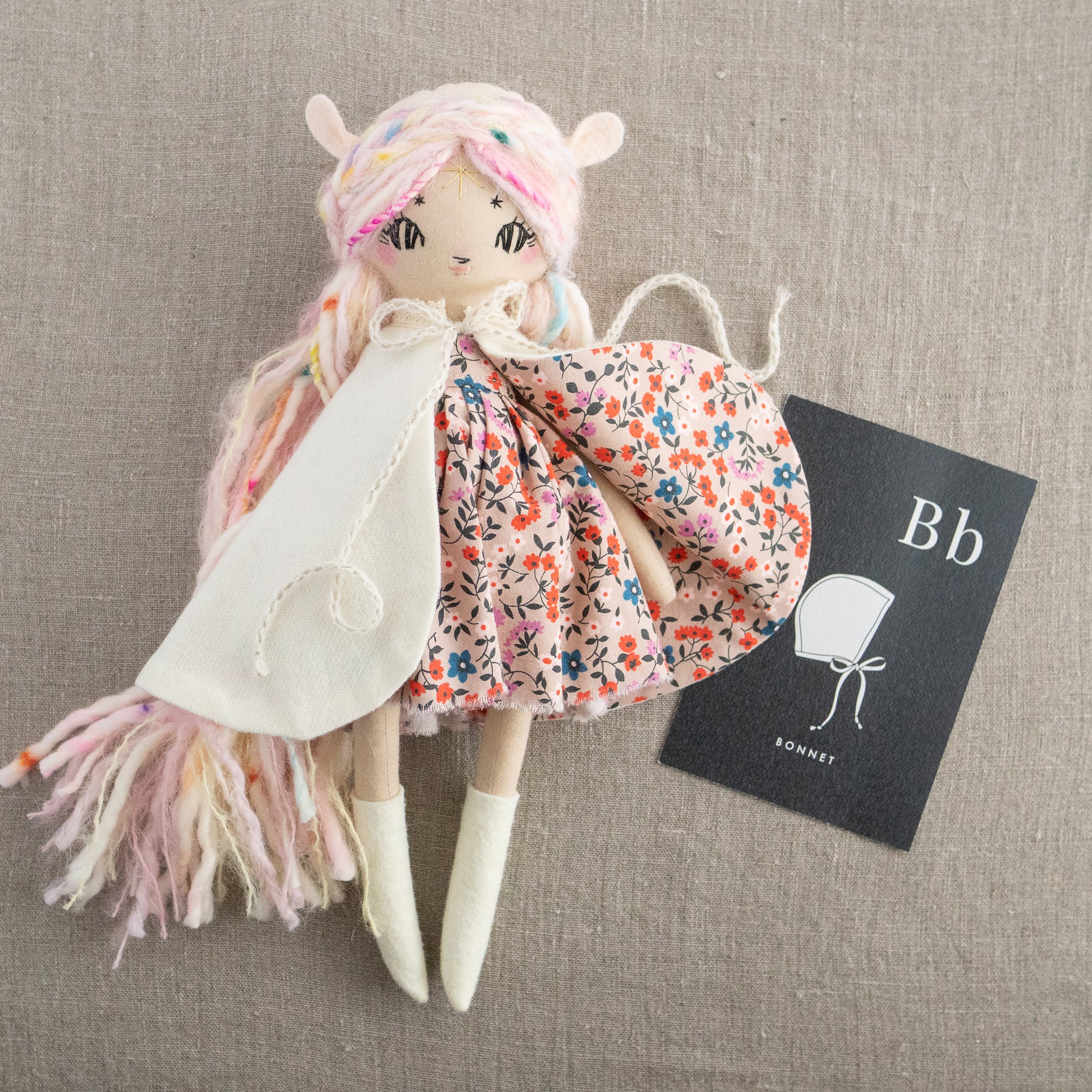 She is made up of cotton, wool/rayon felt, and stuffed with recycled pollyfill. Her hair is a combination of wool, mohair, and acrylic yarn. Her arms are button jointed. Each doll is lovingly hand stitched in western North Carolina.