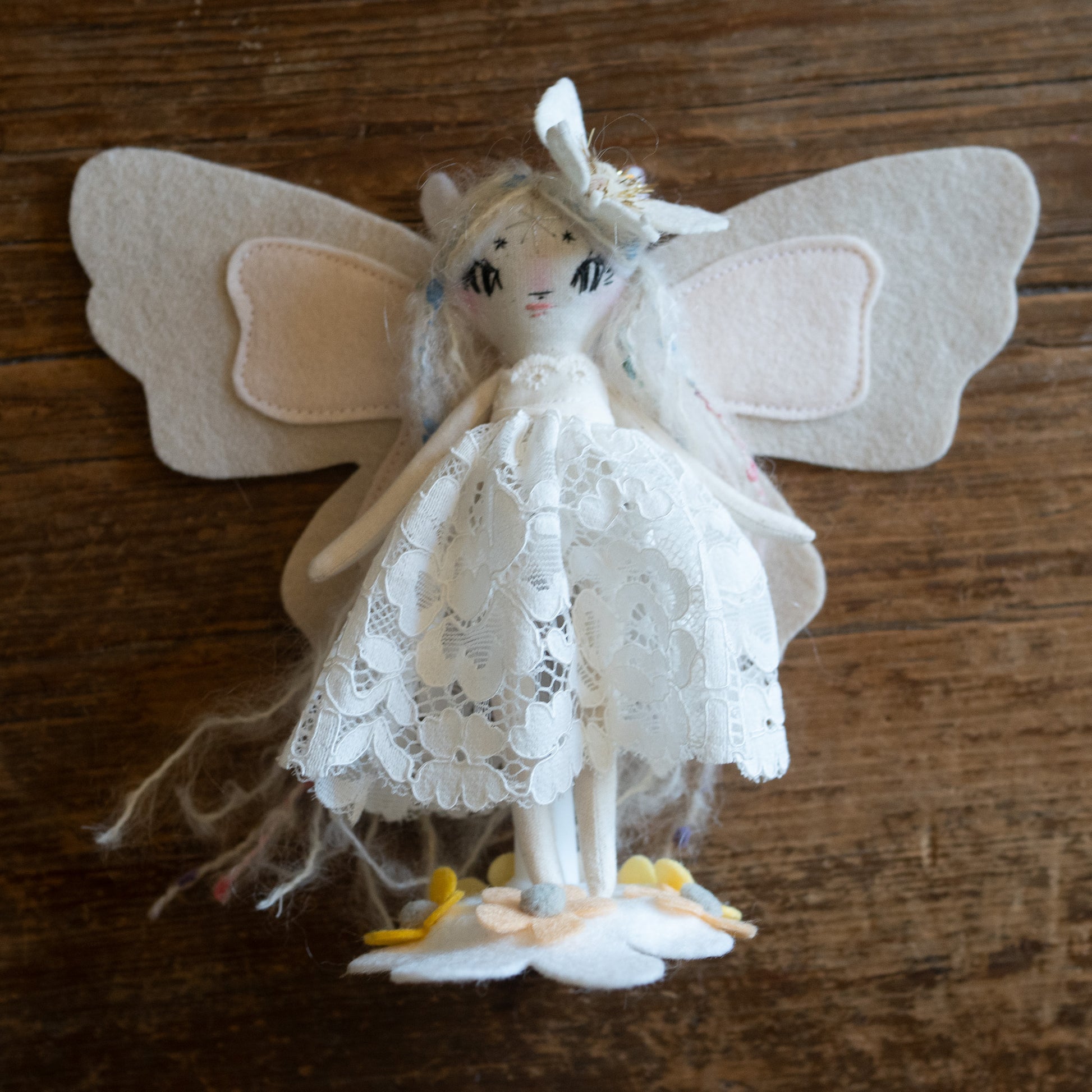 At 5.5" tall these micro pixies are the sweetest little dolls we have ever made. They are truly a labor of love with all their tiny details. These dolls are made out of cotton and wool felt and their limbs are connected with wire. While they are mildly posable we do not recommend changing their position often as they are not a toy and wont stand up to vigorous handling.