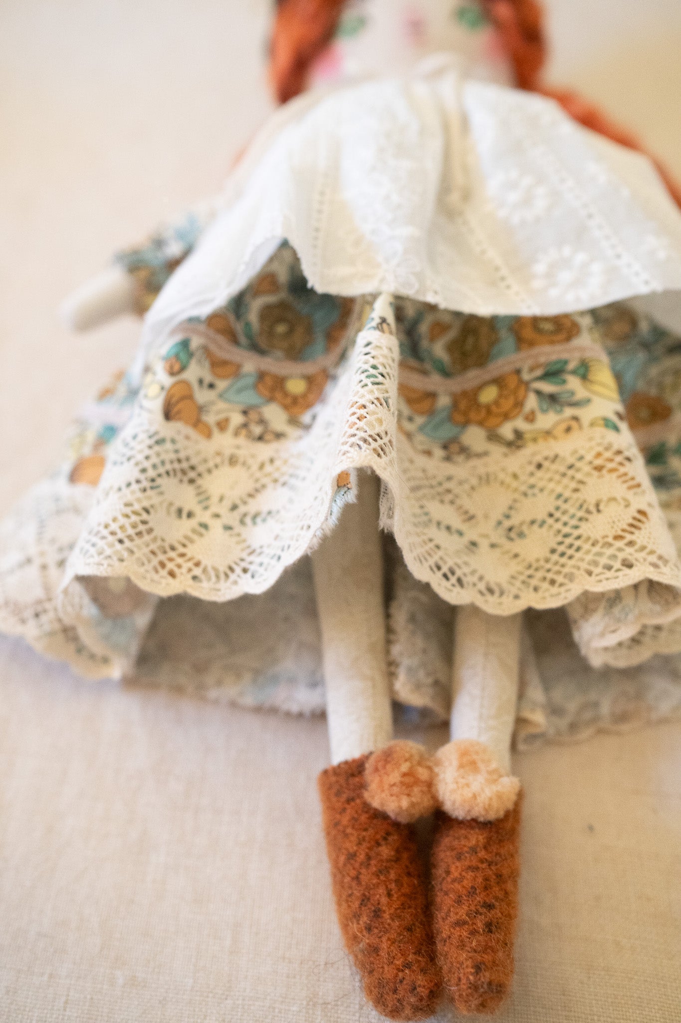 This unique doll is made up of cotton, wool/rayon felt, and stuffed with recycled pollyfill. The yarn hair is a combination of wool, mohair, and acrylic yarn. All of our dolls have button-jointed arms. Each doll is lovingly hand stitched in Asheville, North Carolina.
