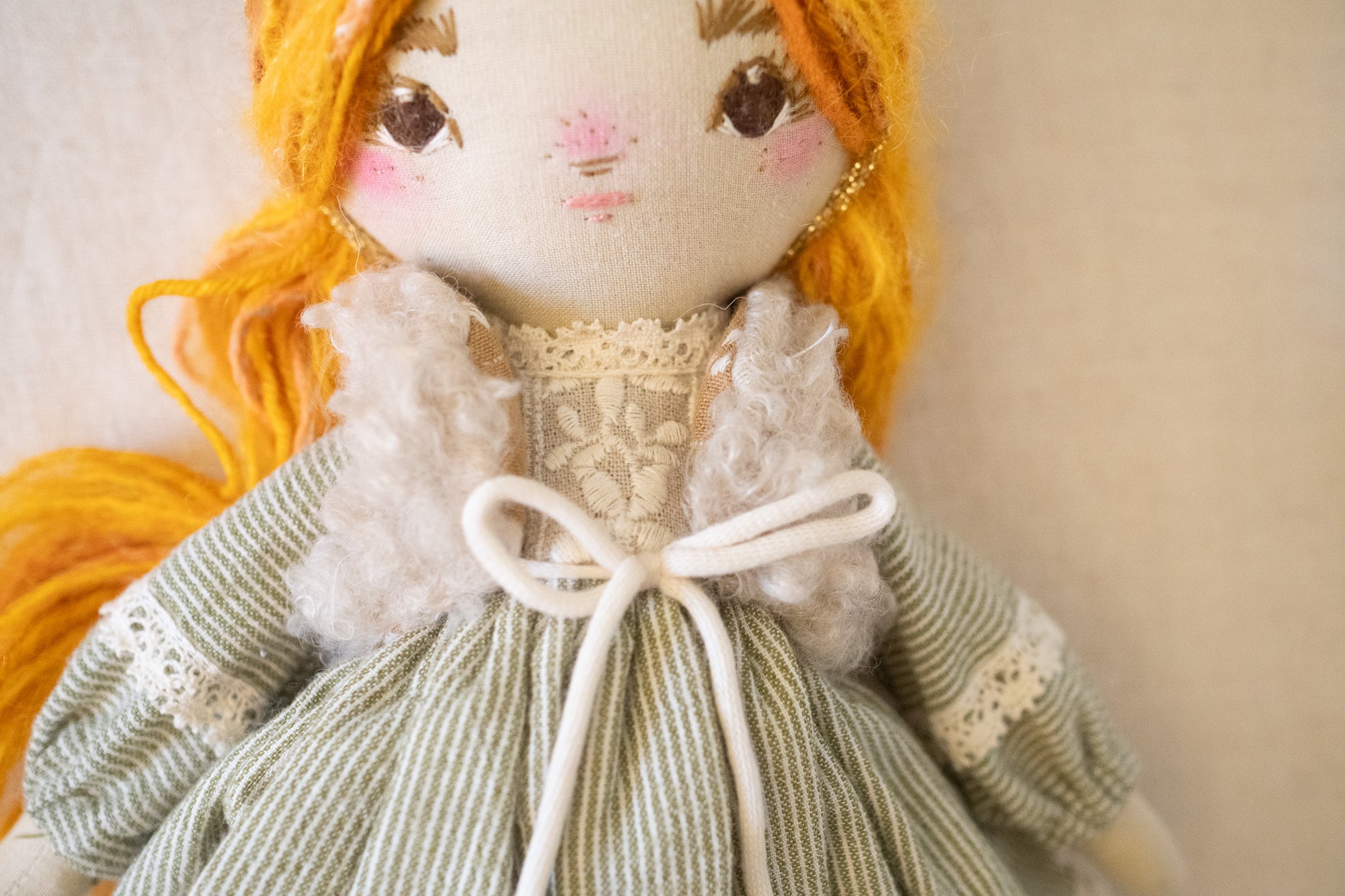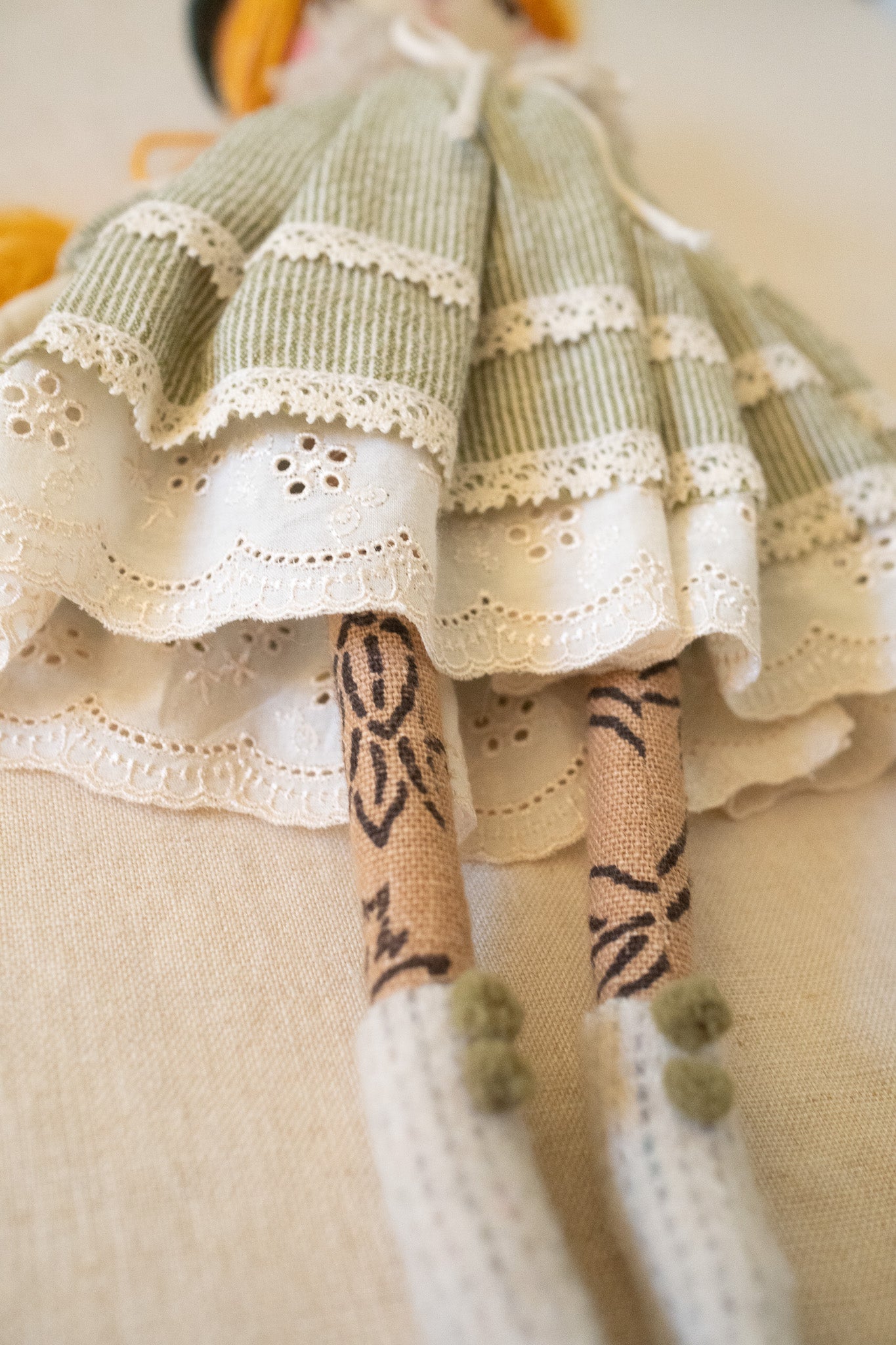 This unique doll is made up of cotton, wool/rayon felt, and stuffed with recycled pollyfill. The yarn hair is a combination of wool, mohair, and acrylic yarn. All of our dolls have button-jointed arms. Each doll is lovingly hand stitched in Asheville, North Carolina.