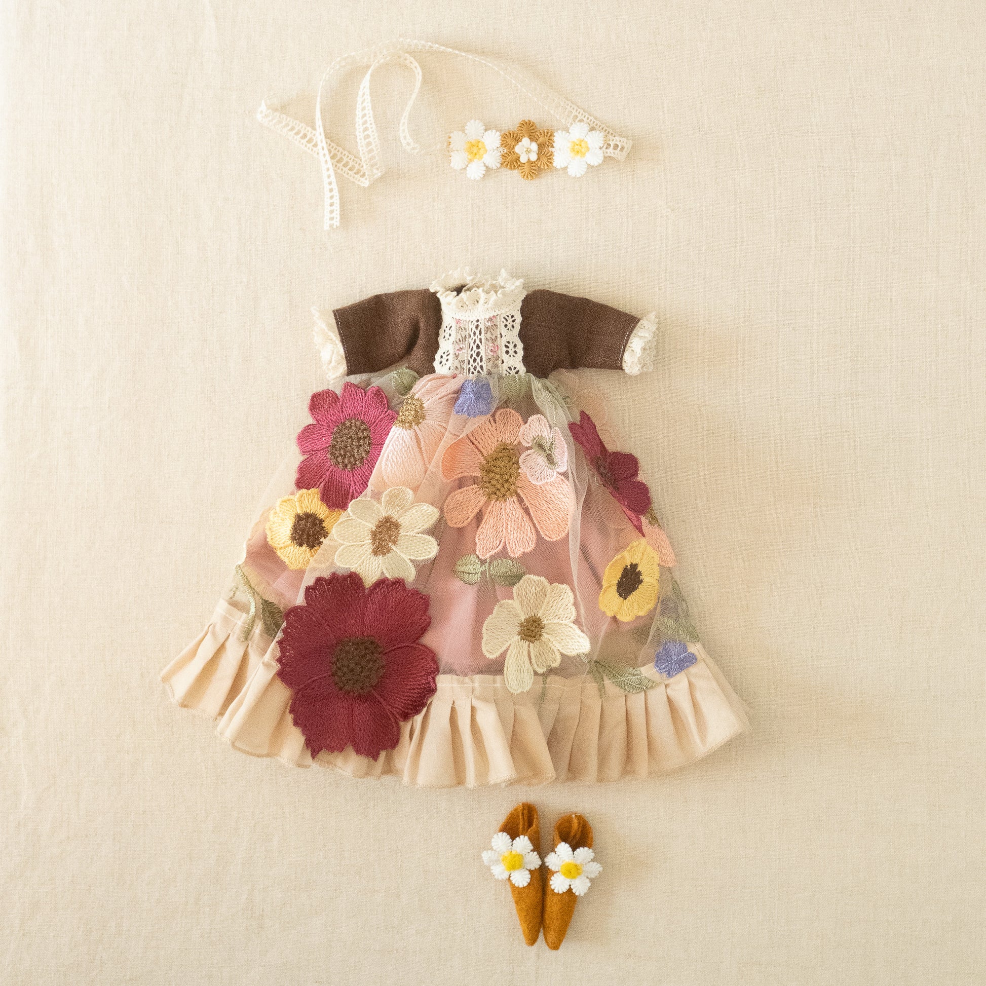 This set includes - an embellished flower crown, detailed folk dress with large flowers and trim, and fancy felt boots with flower aplique